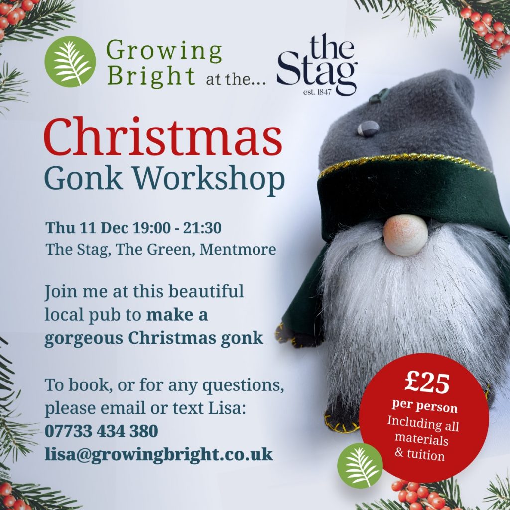 Join me at this beautiful local pub to make a gorgeous Christmas gonk. Our gonks will be made as eco as possible, using fabric offcuts and stuffed with rice.
